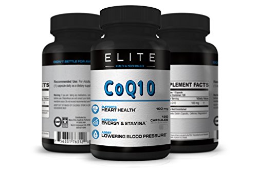 Elite Health and Performance CoQ10 100mg and 120 Capsules is manufactured in the USA under strict GMP standards in an FDA approved Facility. Coq 10 benefits: total heart health , Heart Health Supplements , lower high blood pressure supplement or high blood pressure medicine, natural blood pressure reducer, healthy aging or anti-aging pills , cholesterol lowering vitamin, lower ldl cholesterol , lower cholesterol naturally and reduce cholesterol Coenzyme Q10 is found in every cell of the body. CoQ10 is naturally made, and your cells use it to produce energy your body needs for cell growth and maintenance. It is a potent antioxidant, CoQ10 helps maintain healthy blood pressure and cholesterol levels, promotes arterial health and supports a strong heartbeat 100% money back guarantee. Enjoy your free E-Book "Amazing Benefits of CoQ10" and also 25% off coupon for your next purchase. We take pride in the best supplements....Don't settle for Average!Feature