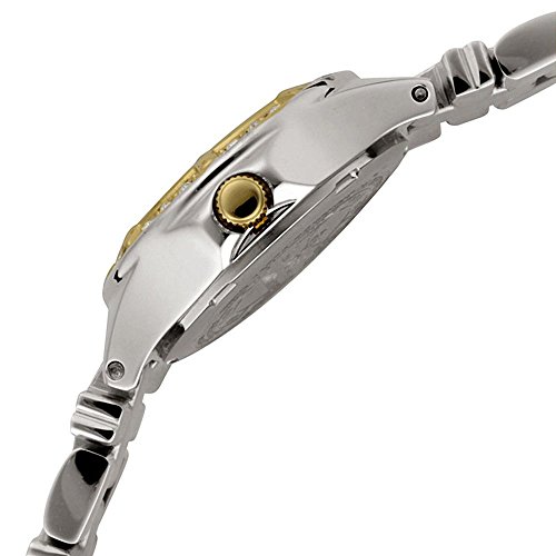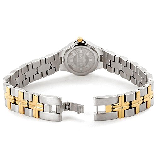 The Invicta Women's Wildflower Collection Watch looks to be fit for a queen, or at least will offer some luxurious style to your day or night. The small round brushed-and-polished silver-toned stainless steel case is topped with an 18k gold-plated bezel. The golden bezel also features 24 shimmering Austrian crystals. The crystals continue down the center of the two-tone silver and gold bracelet. A white dial shows off a dainty display that features a gold-toned Arabic numeral 12 at the top of the dial, gold-toned matchstick indices, and gold-toned hour, minute, and second hands. The exquisite silver-toned stainless steel bracelet features 18k gold-plated accent links and securely fastens with a jewelry clasp. This timepiece offers reliable Swiss quartz movement and is protected by a durable flame-fusion crystal. The watch is also water resistant to a depth of 165 feet (50 meters).Wildflower Collection