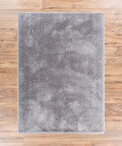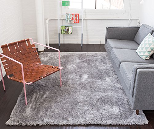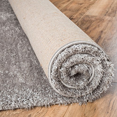 Shimmer Shag Silver Grey is a sophisticated and eye-catching solid color rug with a cozy, retro feel. A mix of two types of 100% polyester fiber gives an exceptional look and silky soft hand. Short, twisted yarn provides plushness while long, thin yarn gives a brilliant and shiny textured hand. The yarn is stain resistant and doesn't shed or fade over time. A 100% jute backing is safe for wood floors and all four sides of the rug are serged for improved durability. Perfect for the living room, dining room, bedroom, entryway, hallway, great room, den, family room, nursery, playroom, or children's room.Feature