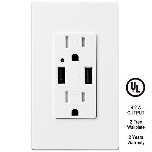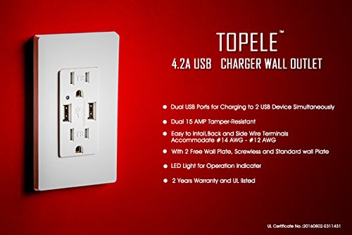 TOPELE High Speed USB Charger Outlet, 4.2a USB Wall Charger Duplex Receptacle, 15A Tamper-Resistant Receptacle with 2 Free Wall Plates, for iPhone X, iPhone 8/8 Plus, Samsung Galaxy and more, White