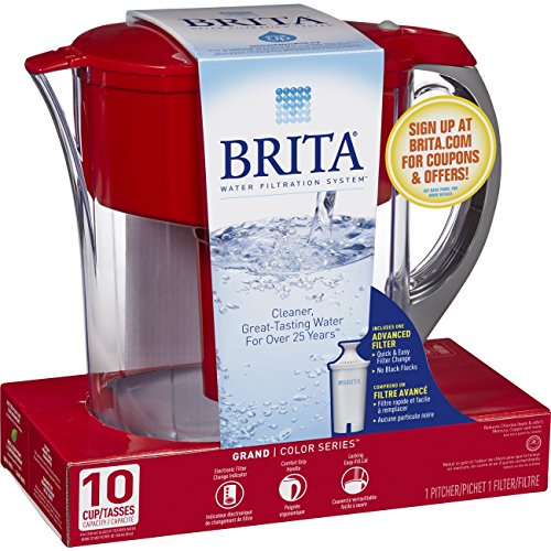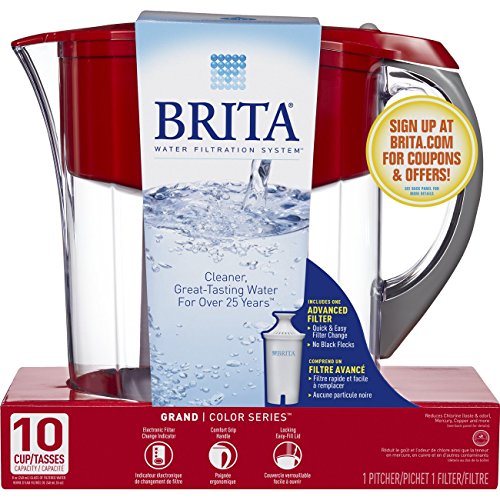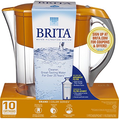 With the Brita 10 Cup Grand Water Filter Pitcher, it is easy to drink healthier, great tasting water. Using technology which combines coconut-based activated carbon with ion exchange resin, the Brita advanced filter reduces the taste and odor of chlorine to deliver great tasting water while removing copper, mercury and cadmium impurities that can cause illness over time. The Brita Grand Pitcher is BPA-free and comes with an electronic filter indicator which notifies you when it is time to replace your filter. Change your filter every 40 gallons or approximately every two months. The large, 10 cup capacity makes this pitcher perfect for kitchen and office refrigerators. Ergonomically designed, this water filter pitcher features a flip top lid for no fuss refilling and a comfort grip handle for easier pouring. By drinking filtered water, you are reducing the amount of plastic bottles that end up in our landfills and oceans. One Brita water filter used equals 300 plastic bottles saved. Start drinking healthier, great-tasting water with Brita today.Feature
