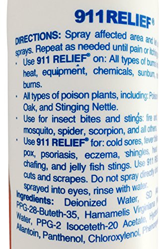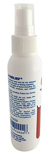 - Feature : MULTI-PURPOSE spray is a 4oz bottle, multi-purpose spray that replaces the need for multiple other products and saves you money! Pump spray action (not an aerosol). Also safe for pets hot-spots. / RELIEVES irritation, pain, swelling, itching, blistering, and redness from insect bites and stings, including: fire ants, all other ants, spiders, fleas, chiggers (red bugs), buffalo/turkey/no see-um gnats, mosquitoes, scorpions, bee's wasps, and all other insects. RELIEVES irritation, itching, swelling, and blistering from: poison ivy, poison oak, poison sumac, bull nettle, and all other poison plants. / RELIEVES symptoms of heat rash, jock itch, athlete's foot, fever blisters/cold sores, chicken pox, shingles, psoriasis, eczema, acne, pimples, ring worm, head lice, jelly fish stings, sunburn, heat, fire, windburn, and more! / HOW DOES IT WORK? 911 Relief brings your skin back to a normal PH balance, eliminating swelling and pain. Kills all forms of bacteria (including MRSA) within 5 minutes. / SAFE: Planet safe, hypo-allergenic and biodegradable with no harmful chemicals. Will not stain clothing. Cold and heat have no effect on this product. Indefinite shelf life. Made in the USA!