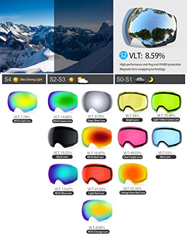 Brand ZIONOR delivers superior quality goggle with durable material, innovation design and professional pre-sale, after-sale service and solid warranty policy. Our Lagopus series dual-lens goggles featured with anti-fog, anti-wind and 100% UV protection to protect your eyes when skiing, snowboarding, snowmobiling and other snow sports. Clear vision at day night in all weather condition: Different lens VLTs offer great panoramic vision and clean sight for all the way on the slope. Compatible with your own sport gears: The Lagopus series snow goggles come with adjustable extra-long head strap which compatible with helmet and different head sizes from teenager to adult. Keep you warm, keep the goggle tight, keep the view clear and keep you safe on the slope! Main Features Anti-winds and keep you warm. Magnet quick lens-changing system for better lens swapping and cleaning. Anti-fog and two way venting for clear and clean vision. Comfortable triple-layer foam for face fitting. 100% UV400 Protection. PC lens TPU frame for impact-resistance. Elastic strap for better helmet compatibility. Specifications: Lens Material: PC Frame Material: TPU Lens Style: Spherical double layers Lens Finish: Real Full REVO Coating Magnet Lens-changing: 8 magnet spots UV400 Protection Coating: Yes Anti-fog Coating: Yes Friendly Notice Please do not use finger or rough cloth to wipe and clean the lens as they will either stain or scratch the lens. Please keep the goggle in the pouch or box instead of facing on the ground or desk. Please do not use mascara or other oily substance in case lens gets dirty. Please air-dry the goggles after every snow sport e.g. skiing, snowboarding and etc. Please do not wipe the inner lens which will invalidating anti-fog function. 0 |