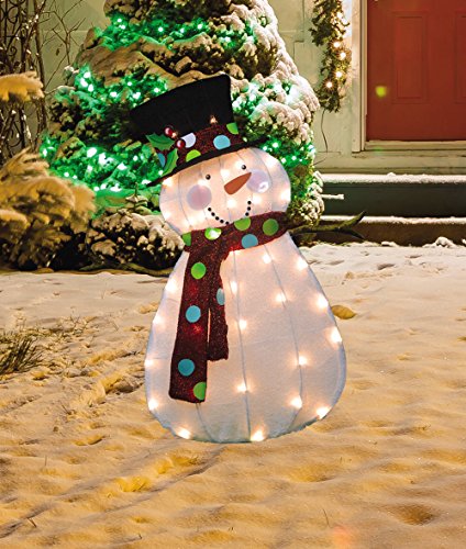 Proudly show off your Christmas spirit with the ProductWorks 32-Inch Pre-Lit Victoria Hutto Snowman Christmas Yard Decoration. This yard statue features a holiday Snowman dressed with a top hat and scarf to bring you cheer. Pre-lit from within, the statue has 35 clear mini LED lights that illuminate it with a holiday cheer. The sturdy steel form is covered by colorful, soft fabric for a classic, whimsical look that makes any home feel festive. Great for indoor and outdoor use, the Victoria Hutto Snowman Christmas Yard Decoration comes with ground stakes and spare bulbs to secure the statue and ensure it's always shining a little light in the neighborhood. Measures 32" L x 20" W x 6" H.Feature