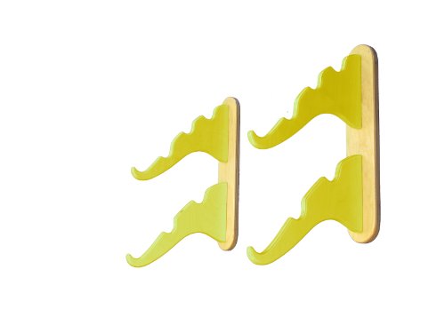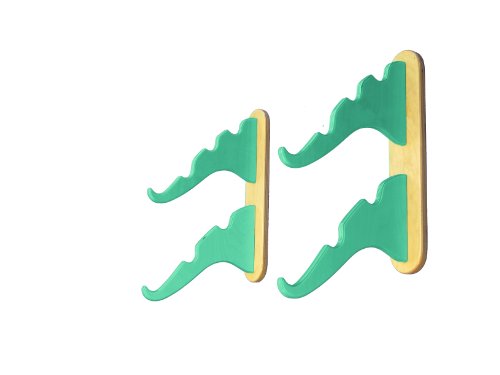 These USA made, double configuration racks are patented multi function display systems whose strength you can trust to securely organize and beautifully display three offshore fishing poles and four inshore fishing poles of your choosing. Easy to install wall mounted back plates for the double configuration are 20" tall and the elephant inspired trunk arms protrude only 14" from the wall. This customizable furniture grade storage solution, constructed from 13 layers of laminated birch for strength as well as aesthetics, is designed to protect your investment by getting them off the floor and onto the wall where you can proudly display your adventurous soul. In addition to the different trunk sizes, you can choose from 7 hot trunk colors that each pop beautifully against the natural wood back plates. The Surf-Trunks line of display systems also includes single and triple configurations, as well as an SUP rack that boasts a patented paddle storage feature. Product Dimensions: 2 back plates 4"x20" Total installed length: 22.25" with 14" protrusion.Feature