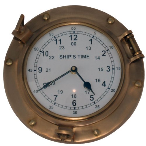 -. Feature : Porthole clock is made from solid antiqued brass / Nautical Timekeeper measures over 9" with large 6" clock face / Porthole swings open for changing clock batteries and time setting