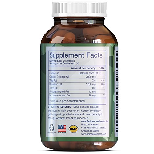 Boost the immune system, get control of your cholesterol levels, burn belly fat and lose weight all thanks to this organic extra virgin Coconut Oil pills from Brandon Sciences. This supplement has been suggested to be better than sunflower oil and olive oil for weight loss and melting irritating stomach fat. The fat contained within these weight loss pills for women and women is converted to be used as energy rather than being sent to be stored as fat within your body. They have loads of healthy saturated fat called medium-chain triglycerides - which is a healthy form of saturated fat that works to promote weight loss. This substance can help to regulate cholesterol levels and actively lower blood pressure. This is a wonderful supplement that can promote a healthy level of the good HDL cholesterol within your body and help to lower triglycerides. These softgels contain 2000 mg of pure, cold-pressed Coconut Oil and are fast dissolving. They can also help reduce the symptoms of fever and lower swelling. Take one or two per day along with meals, or as directed by a healthcare professional.Feature