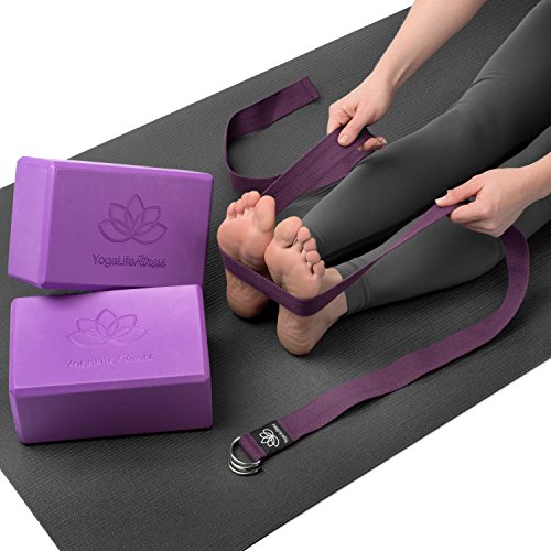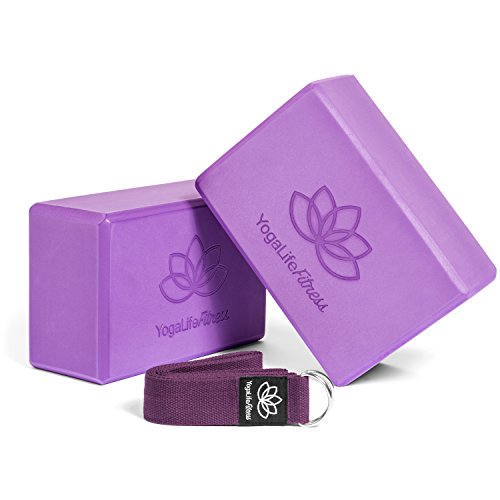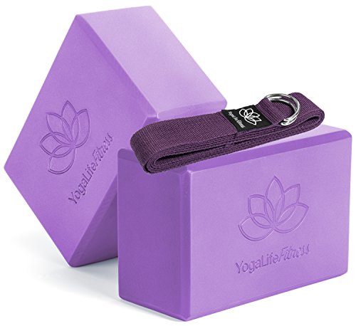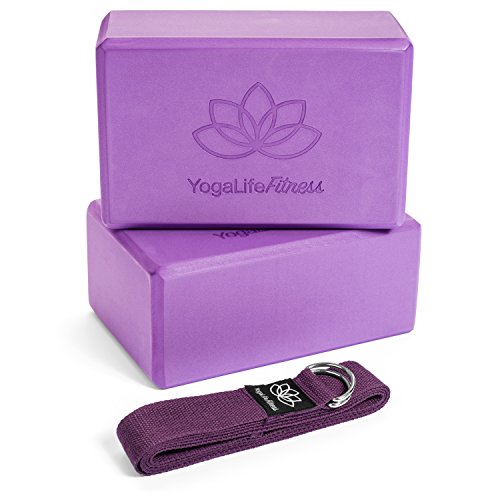 Yoga Life Fitness (Set of 2) Premium Yoga Blocks 9"x6"x4" and Yoga Strap (6 Feet) - Durable Long Lasting, High Density Eco Friendly EVA Foam Exercise Brick, Perfect for Yoga, Pilates, and P90X