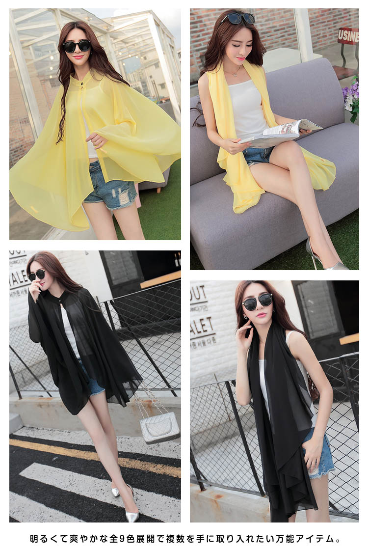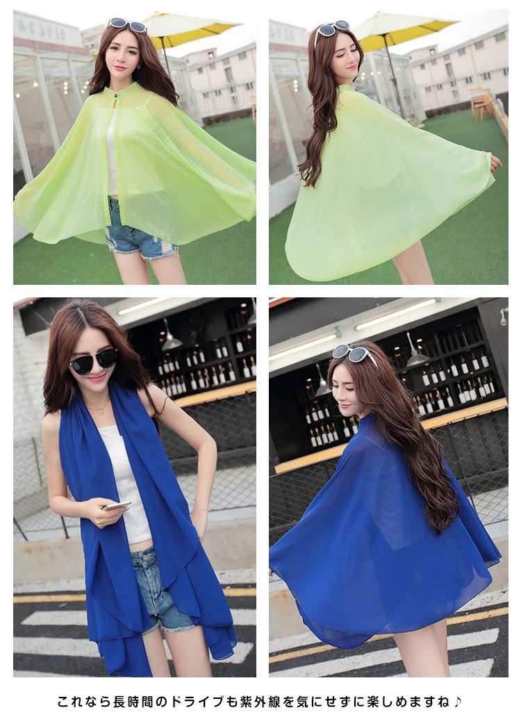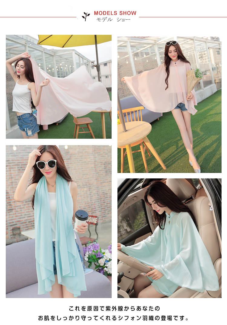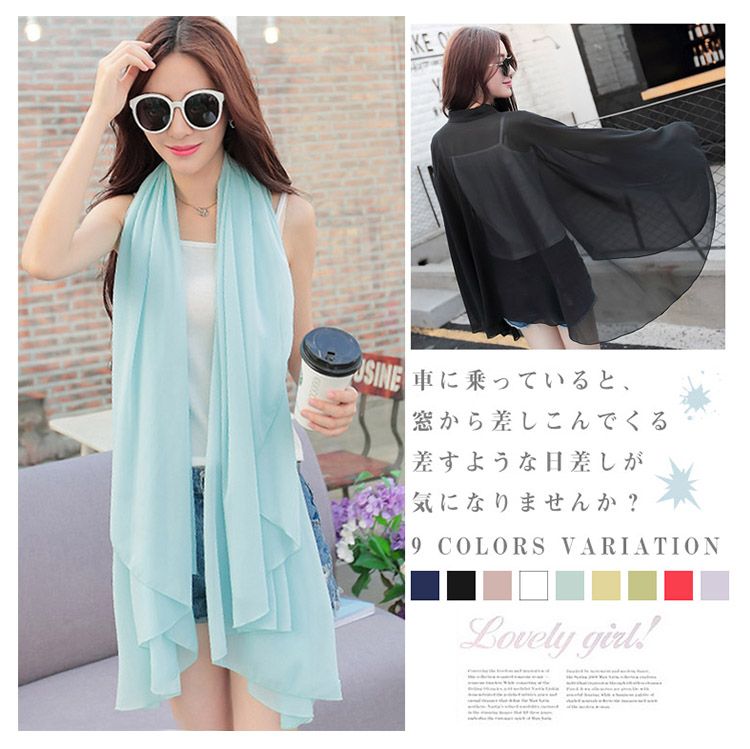 | 車に乗っていると、窓から差しこんでくる差すような日差しが気になりませんか?これを原因で紫外線からあなたのお肌をしっかり守ってくれるシフォン羽織の登場です。肩から羽織れば、太陽の光が当たる部分をほとんどカバーして、しっかり紫外線予防してくれます。これなら長時間のドライブも紫外線を気にせずに楽しめますね♪明るくて爽やかな全9色展開で複数を手に取り入れたい万能アイテム。 | |