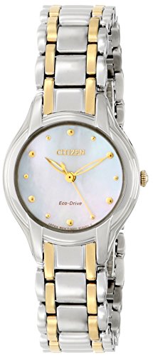 -. Binding : Watch -. Brand : Citizen -. Color : Two Tone Stainless Steel -. Department : womens -. EAN : 0013205107320 -. Feature : Eco-Drive is fueled by light so it never needs a battery / Two tone stainless steel bracelet with mother of pearl dial / 3 Hand Basic / Mineral Crystal / Water resistant to 99 feet (30 M): withstands rain and splashes of water, but not showering or submersion -. Label : Citizen -. Manufacturer : Citizen -. Model : EM0284-51N -. MPN : EM0284-51N -. PackageQuantity : 1 -. PartNumber : EM0284-51N -. ProductGroup : Watch -. ProductTypeName : WATCH -. Publisher : Citizen -. ReleaseDate : 2014-06-23 -. Studio : Citizen -. Title : Citizen Women's EM0284-51N Silhouette Analog Display Japanese Quartz Two Tone Watch -. UPC : 013205107320