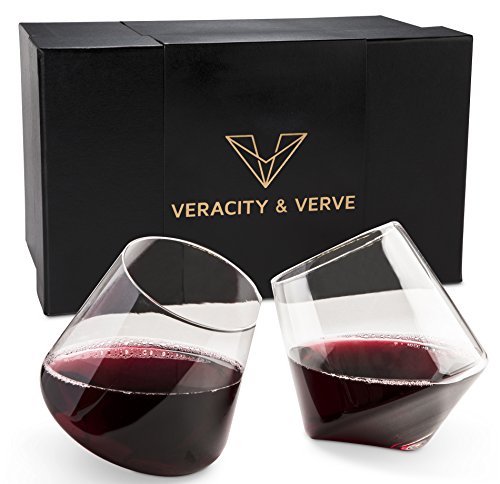 Studio : Veracity Verve Publisher : Veracity Verve Product Description A Glass With Class There are thousands of wine glasses available on the market, yet most of them look the same and primarily function to hold wine. When we designed these aerator wine glasses, we wanted to take the functionality aspect to an entire new level. With these stemless wine glass goblets, you're not just getting a premium, high quality set of wine cups; you're getting uniquely-designed aerating glasses that help expand the notes in your red wines while also looking elegant and feeling luxurious to the touch. Don't Forget The White Wines While aerating white wines isn't necessary, it doesn't mean that these these red wine glasses don't work perfectly as white wine glasses just as effectively. When you pick out a wine from the store, it's often the looks of the bottle that capture your interest. That's because we make the connection that what's pleasing to our eyes will also be pleasing to our lips. The same theory is true with wine glasses. A good Pinot Grigio just won't taste the same in a plastic cup as it will in a classy glassware. With the elegant feel of our glass combined with the unique structure of it, you'll want to drink everything out of one of these Veracity Verve glasses. Product Dimensions and Accessories: Your purchase comes with 2 hand-blown, glass aerating glasses that tilt, each holds about 12 oz of liquid. It comes in an elegant black gift box with velour-lining and a sleeve with the Veracity Verve logo printed in gold on the front. 0