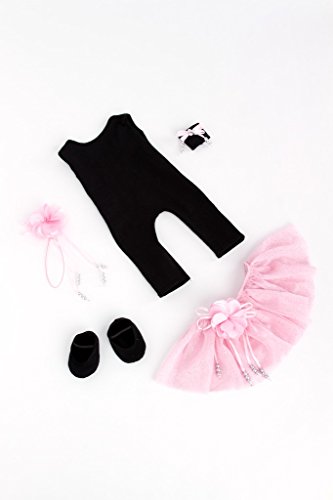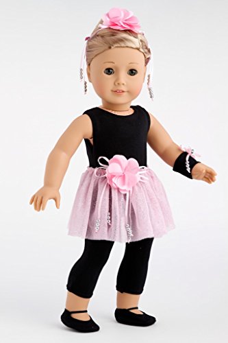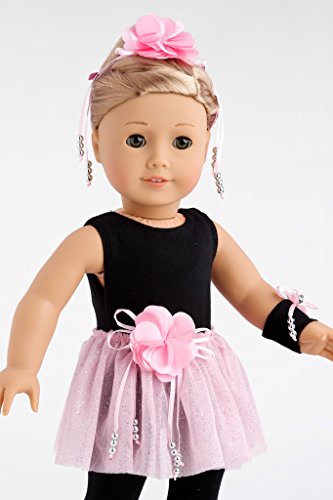 -. Feature : A sleek black unitard with a flowy tutu made of sparkling pink mesh with a decorative corsage of satin flowers embellished with ribbons and silver pearls, matching hair piece, black ballet slippers and wristband decorated with pink ribbons and silver pearls. / Outfit contains a wide back closure for easy dressing and clothing removal. / 18 inch doll clothes fits American Girl dolls. / Designed in the USA and sold Exclusively by DreamWorld Collections. / DOLL NOT INCLUDED