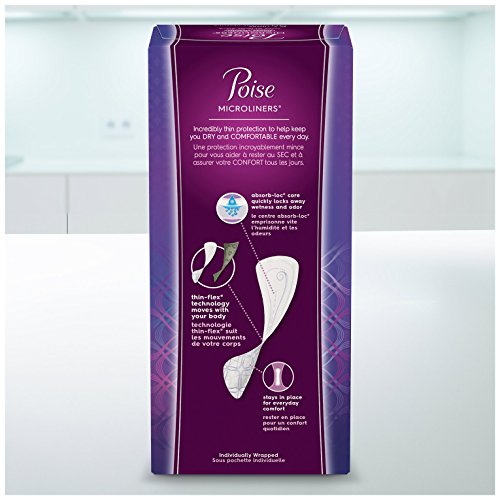 ReleaseDate : 2017-02-27 Studio : Kimberly-Clark Corp. Publisher : Kimberly-Clark Corp. Binding : Health and Beauty Product Description Our thinnest liners yet, Poise Microliters are designed to help you seize your moment with just enough absorbency to handle the occasional leak. Surprisingly absorbent and incredibly thin, Poise Microliters instantly absorb wetness better than period-only liners for protection that outlasts your day vs. leading period liner for discreet light bladder leakage (LBL) protection. The Absorb-Lock core quickly locks away wetness and odor. Wear these liners with Thin-Flex technology that moves with your body and stays in place for everyday comfort. This package contains individually wrapped Poise Incontinence Microliters in long length. Poise is the number one brand for light bladder leaks. These long pant liners are 6.9 in (17.5 cm) in length. 0