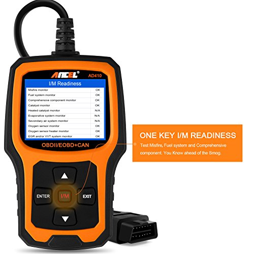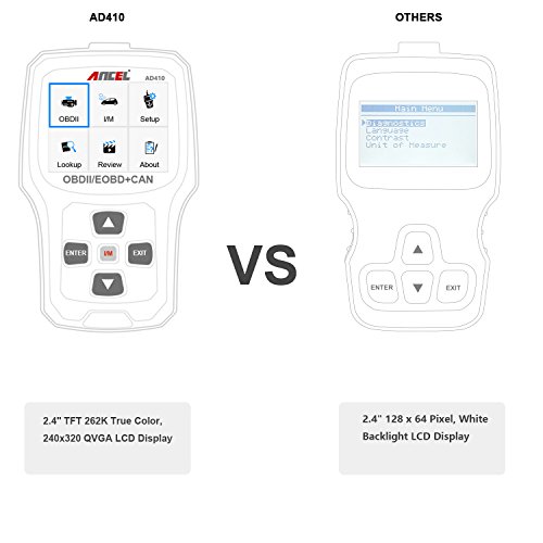 - QVGA DISPLAY & NEW UI - AD410 code reader is a great upgrade from the more basic diagnostic scan tool. It has a 2.4" TFT true color (262K) LCD display, indicates test result more clearly. With the easy-to-read UI designed, you can easily access among Setup, OBDII Diagnostics, I/M readiness, DTC Lookup and Review, don't even need to read the manual to know what to do, even a beginner can earsily use this unit.