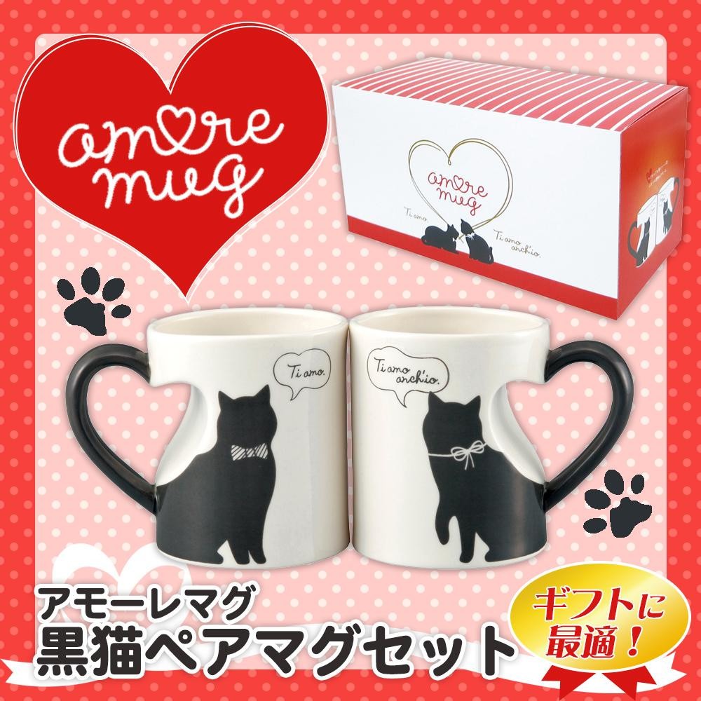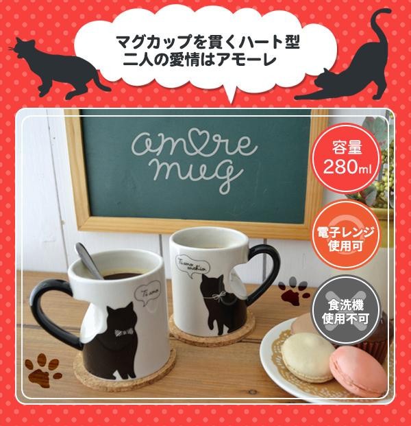 | ボディの形状としっぽのハンドルでハートマークを表現したマグカップのセットです。背面には寄り添い合う仲のいいネコたちの姿が描かれており、プレゼントにもおすすめです。 |