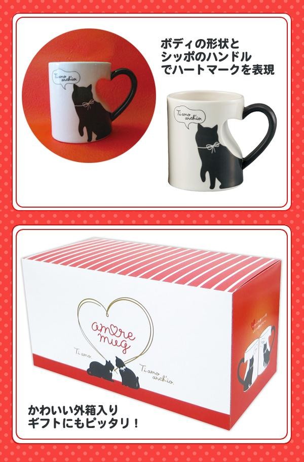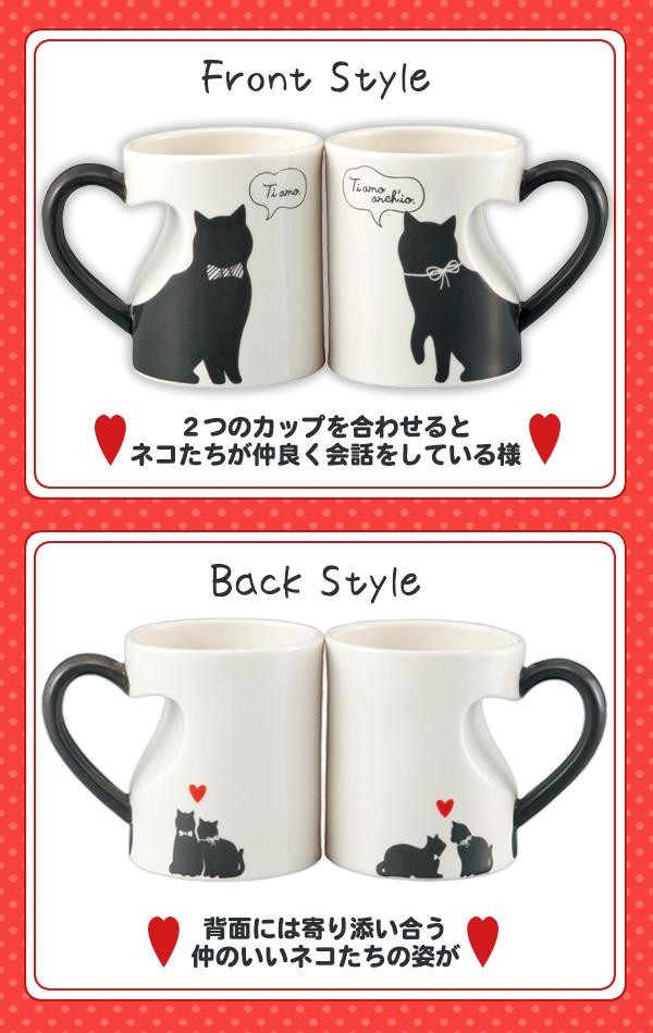 ボディの形状としっぽのハンドルでハートマークを表現したマグカップのセットです。背面には寄り添い合う仲のいいネコたちの姿が描かれており、プレゼントにもおすすめです。 |