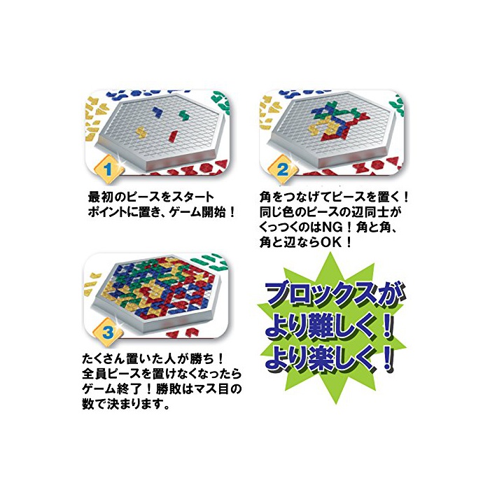 각색22개의 형태가 다른 피스를 번갈아 두어 나가는 점거해 게임에,마지막에 자신의 피스를 많이 둔 사람이 승리.