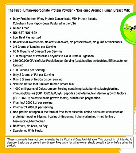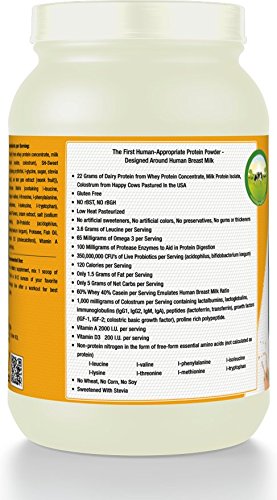 -. Feature : The first human-approP.R.Iate protein powde to mimic the protein fractions, amino acids, peptides and micronutrient composition of mother's milk / Truly all natural, no artificial colors, sweeteners, flavors, gums, thickeners, lsifiers or flavors / All dairy protein and colostrum from grass pastured cows inside the USA and then low-heat pasteurized to maintain quality / We guaranty quality and potency. We make our postproduction lab analysis of each batch produced available to the general public so you know exactly what's in each batch and what's not! / Made in the USA from dairy proteins sourced from happy cows on American pastures