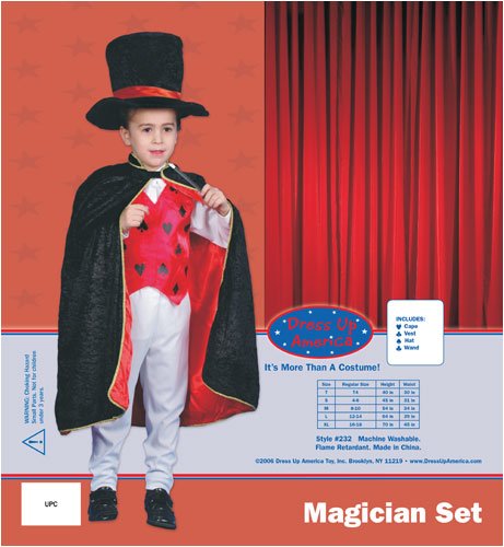 -. Brand : Dress Up America -. Color : NA -. Department : unisex-child, , , , -. Feature : ► Product comes complete with: Cape, Vest, Top-Hat and Wand / ► Deluxe crushed Velvet cape, with beautiful Gold trimmings / ► You take on the dark, sinister look of a medieval magician / ► Set packaged in durable snap-sealed poly bag / ► Enjoy some fun in this Magician Costume -. Label : Dress Up America -. Manufacturer : Dress Up America -. Model : 232 -. MPN : 232-L -. NumberOfItems : 1 -. PackageQuantity : 1 -. PartNumber : 232-L -. ProductGroup : Toy -. ProductTypeName : CHILDRENS_COSTUME -. Publisher : Dress Up America -. Size : Large -. SKU : WC23157 -. Studio : Dress Up America -. Title : Deluxe Magician Role Play Costume Set For Kids By Dress Up America