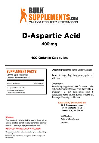 BulkSupplements Pure D-Aspartic Acid Capsules - 600mg (100 Gelatin Capsules)