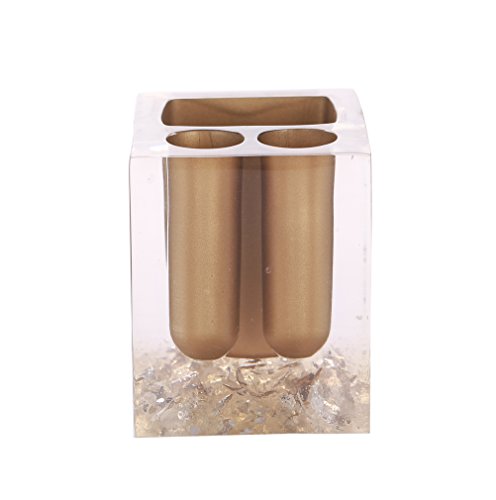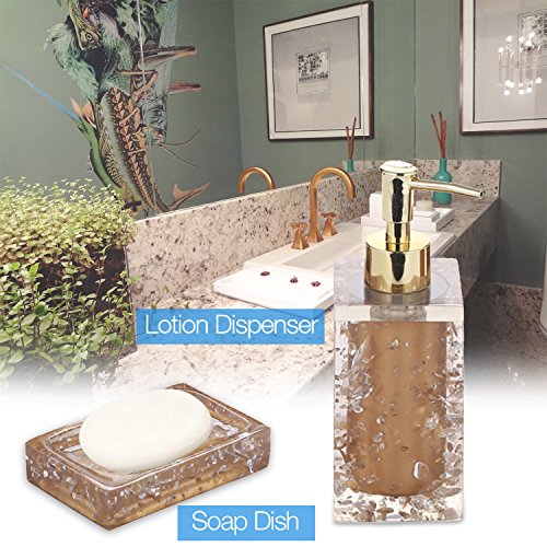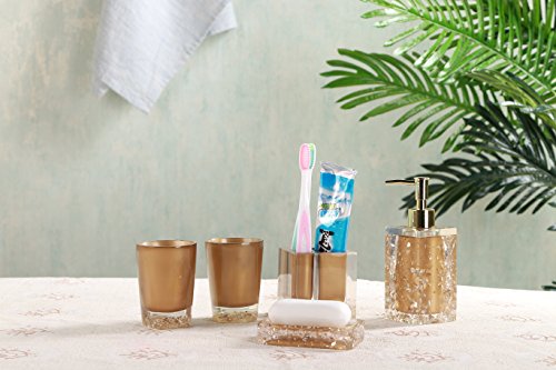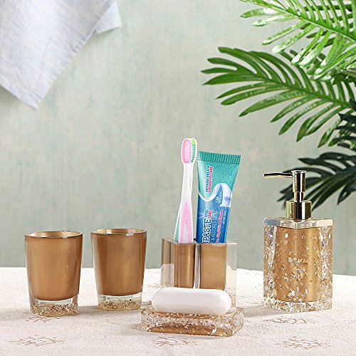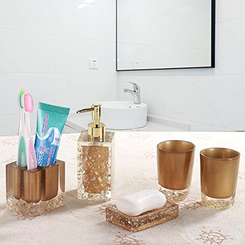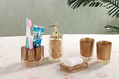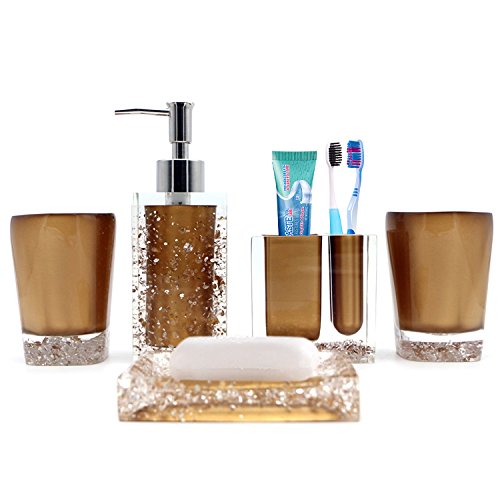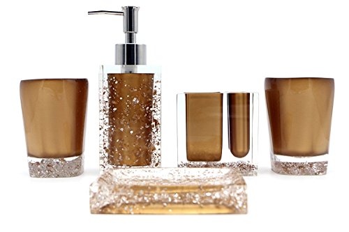 Studio : Modern Bath Publisher : Modern Bath Product Description Complete any contemporary bathroom with the charm and style of this excellent 5-piece powder room accessory set. With everything you need to transform your bathroom, this beautiful set is perfect for any home. Featuring a unique glossy gold design with bronze colored accents, this set is sure to do wonders to any home. Features: 5-piece bathroom set Made of resin Finish: Bronze with Crystal Chrome accents Glossy gold finish