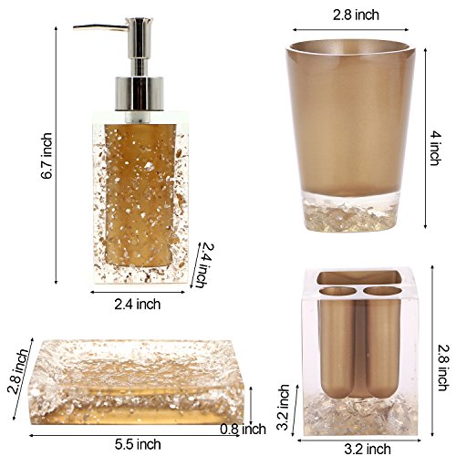 Dimensions: 2 Tumblers:3.9 X2.8 IN Soap Dish:7.9X 4 X 0.8 IN Toothbrush Holder:3.5 X 3 X 1.9 IN Soap Dispenser:6.7 x 2.8 IN NOTE: The digital images we display have the most accurate color possible. However, due to differences in computer monitors, we cannot be responsible for variations in color between the actual product and your screen. 0
