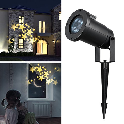 -. Feature : WARM WHITE STAR MOVING SHOW: As you can see from our pictures there are 7-9 big warm white star shown on and moving automatically, creating a magic atmosphere in Christmas, holiday, party, home, garden and landscape decoration! / BRIGHT PROJECTED PATTERN: Our projector light is in best quality, with high brightness LED beads, accessing to brighter projected pattern than other normal projector lamps, which is safe to your eyes. / HIGH QUALITY: With durable ABS and IP44 waterproof design, it can withstand different kinds of weather including sun, rain, intense sunlight or snow outside. / WIDE PROJECTION DISTANCE: The recommend irradiation distance of our projector light is 10-20ft, and it could cover more than 13ft * 13ft area. Longer projection distance, larger snowflake! / EASY TO USE: Our spotlights is very easy to setup and use! Plug in it and the light show will go on! Also, it comes with a garden spike used to set on the ground if you want to use it outdoors.