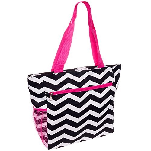 This Chevron Beach Tote Shopper Bag from SilverHooks is ideal for taking to the beach, pool, or shopping. The lined interior with polyester exterior can be quickly cleaned off in the event of a spill while still providing you with a rugged design that won't easily tear or puncture. The spacious, zippered main compartment is perfect for storing towels, groceries, or clothes so whether you're hitting the gym or heading out for the day with your family you'll be sure to stay neatly organized. Two additional slip pockets and a zippered pocket are placed on the exterior for quick access to your keys, wallet, or credit cards. Measures 18.5" x 13.75" x 6.5".