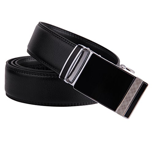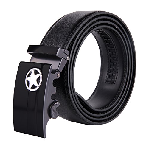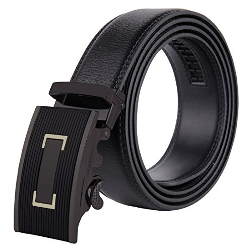 Material: cow split leather strap + Alloy buckle Belt buckle: Automatic buckle (Ratchet belt) Strap Length(Full length of belt strap): All belts we shipped from FBA 124cm Exquisite stitching Note: Usually the default strap length we sent is 50" (125cm), if you need a belt shorter than 125cm please cut it according to your size.
