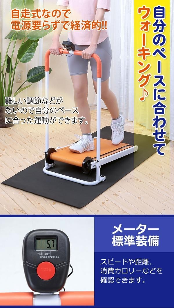 | 仕様 | 駆動方式:自走式 使用用途:歩行用 メーター表示:時間、スピード、距離、カロリー 耐荷重:80kg 折りたたみ時サイズ:(約)幅50×奥行20×高さ101cm 歩行面サイズ:(約)27.5×76cm メーター使用電池:単四電池1本 |