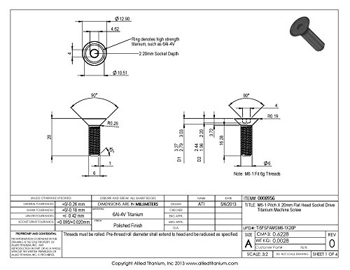 Allied Titanium 0008956, (Pack of 5) M6-1 Pitch X 20mm Metric Titanium Flat Head Socket Drive Machine Screw, Grade 5 (Ti-6Al-4V)