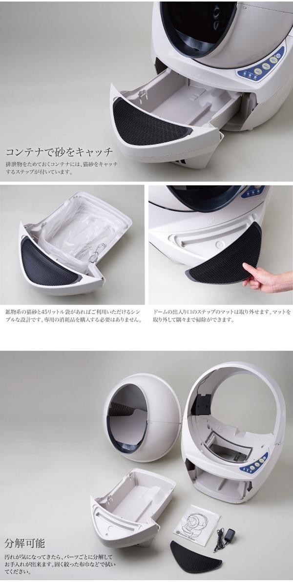 スタイリッシュなデザインの全自動猫トイレです。ドーム型トイレの中に清掃網が付いており、ドームが回転することによってキレイな砂は残して、固まった排泄物だけをコンテナに捨ててくれます。汚れが気になってきたらパーツごとに分解してお手入れが出来るので常に清潔を保つことが出来ます。 |