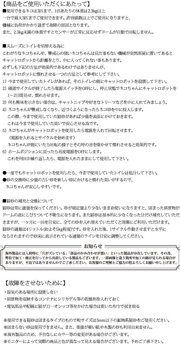 | 付属品 | ACアダプター、排泄物袋3枚、日本語説明書、保証書(12ヶ月) |