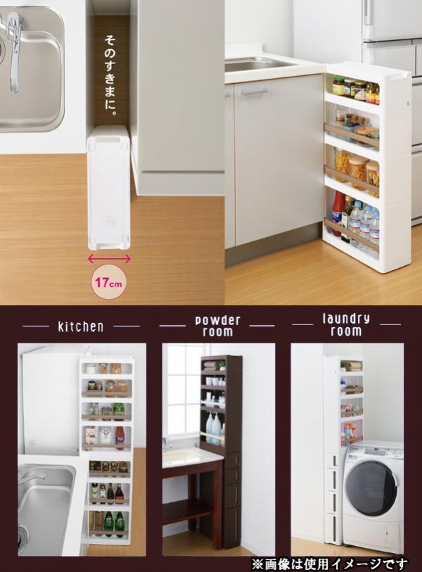 | キッチン、ランドリー、トイレ等のちょっとした隙間に便利な収納ラックです。別売りのドロアーやラックと積み重ねて使用することもできます。またキャスター付きで、ちょっとした移動にも便利です。 |