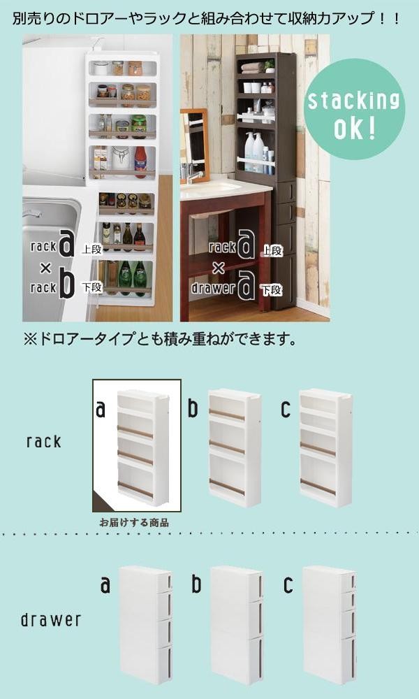 キッチン、ランドリー、トイレ等のちょっとした隙間に便利な収納ラックです。別売りのドロアーやラックと積み重ねて使用することもできます。またキャスター付きで、ちょっとした移動にも便利です。 |