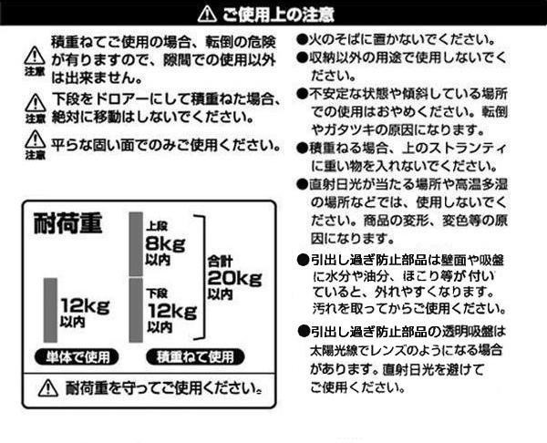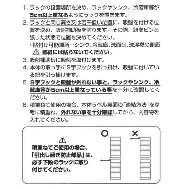 | 素材・材質 | 本体:ポリプロピレン ロック部品・ガイド部品・ガード:ポリプロピレン、エラストマー 仕切りトレー:ポリプロピレン 【引出し過ぎ防止部品】 S字フック:18-8ステンレス 吸盤:塩化ビニル 吸盤補助板:PET樹脂 |