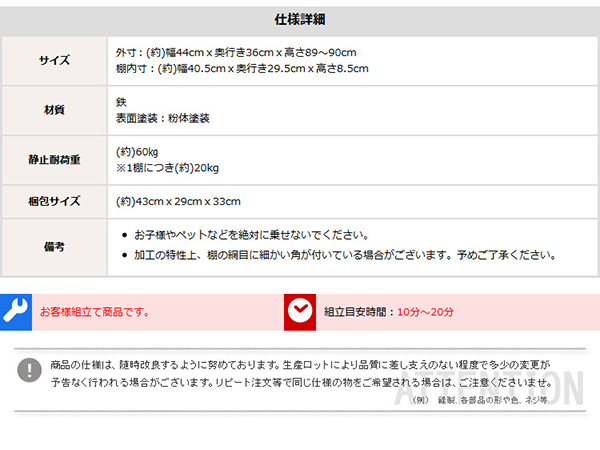 ●中央の棚は高さ調節可能でき、各棚の静止耐荷重は(約)20kg!