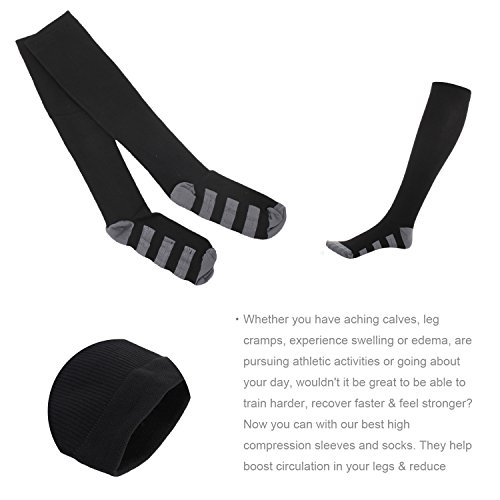 -. Feature : Whether you have aching calves, leg cramps,experience swelling or edema, are pursuing athletic activities or going about your day,wouldn't it be great to be able to train harder,recover faster&feel stronger?Now you can with our best high compression sleeves and socks,They help boost circulation in your legs &reduce the risk of injury. / The sleeves are beneficial for running,hiking,martial arts,cross fit,volleyball,basketball,cycling,baseball,work outs or any fitness activities.Whether high or low or high impact,these enable you to warm up safely and recover quickly.Or to even cover up a tattoo! / The compression leg socks are moisture wicking, ensuring they stay dry and lightweight even during the toughest runs and workouts. / US Size) S/M: Women shoes size 6-7, Men shoes size 7.8-8.5,L/XL: Women shoes size 7-8, Men shoes size 7.5-8.5 / Light weight and portable.
