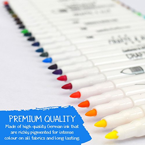 LIMITED TIME DEAL ONLY FOR $10.99!!! PREMIUM QUALITY- This 24 pack Professional Grade Fabric Pen Set includes a wide selection of rainbow,earth and fluorescent colors and uses a DEEPLY RICH PIGMENTED German fabric dye ink producing the HIGHEST COLOR PIGMENT RETENTION and create DIY crafts that looks unique and lasts longer than ever before.