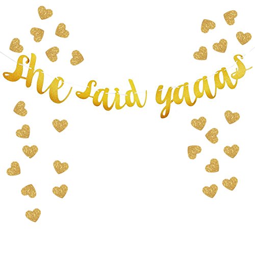 -. Feature : Party decoration:gold felt glitter she said yaaas / Most nice banner:great for bachelorette parties, hens nights, girls night out, bridal showers,wedding party. / Perfect size:the perfect size to put on your wall, ceiling, and hanging from pole to pole. / Package set includes:she said yaaas banner,4 M long heart shape Hanging ornaments, Independent heart shape Pieces of paper 100pcs / Our promise 100% wow guaranteed:have any question, please contact with us,i will answer in 48 hours.
