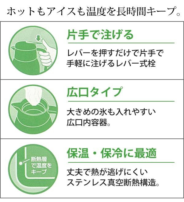 丈夫で熱が逃げにくいステンレス真空断熱構造の卓上ポットです。栓はレバーを押すだけで片手で手軽に注げるレバー式栓。広口タイプなので大きめの氷も入れやすくなっています。 |
