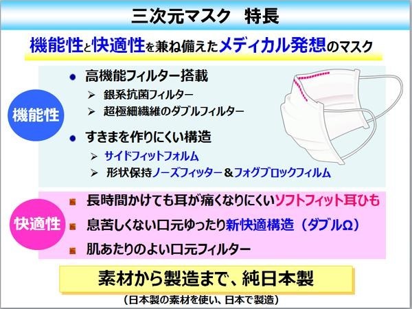 | 高機能・高品質の純日本製、1日使いきりタイプの不織布マスクです。口元の空間をキープし、口の動きにも柔軟に対応しています。ほおにできやすい隙間も低減し、ウイルス飛沫や花粉の侵入を強力にブロック!! 鼻のカーブに長時間しっかりフィットし、鼻の隙間からの侵入を防ぎ、さらにメガネのくもりも強力にブロックします。 |