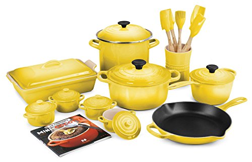 -. Feature : Set Includes: 10.25-inch Cast Iron Skillet, 1.75-quart Cast Iron Saucepan with Lid, 4-quart Rectangular Stoneware Dish with Lid, 4.5-quart Cast Iron Dutch Oven with Lid, 6-piece Utensil Set, 8-quart Enameled Steel Stock Pot with Lid, Four 8-ounce Mini Round Stoneware Cocottes with Lids and a 64-page Le Creuset Mini-Cocotte Softcover Cookbook / Enameled cast iron cookware provides even heat distribution and superior heat retention; colorful exterior enamel resists chipping and cracking / The inner cooking surface features a black enamel finish which requires no seasoning to seal in juices creating a succulent and tender meal / Enhanced handles are 45% larger, distributes the weight evenly and easier to grip when wearing oven mitts / Lifetime warranty; Cast Iron Skillet, Precision Pour Saucepan, and Round Dutch Oven made in France. Stoneware Rectangular Dish, Mini Round Cocottes, Enameled Steel Stock Pot, and Silicone Utensil Set made in Thailand.