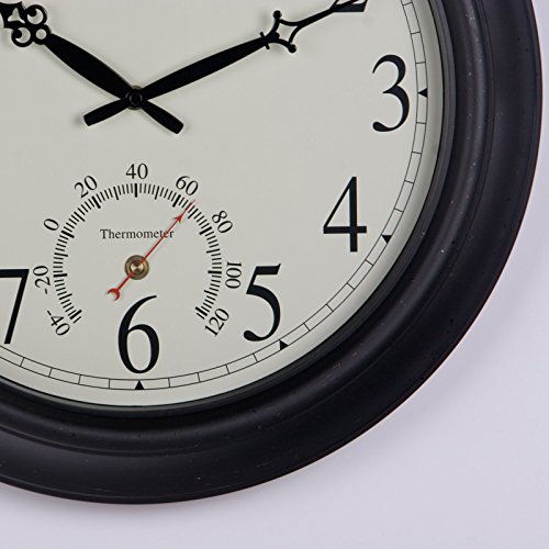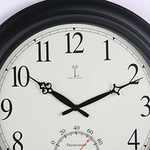 -. Binding : Kitchen -. Brand : Chaney Instruments -. Color : Black -. Feature : 18-inch diameter / Durable metal case with antique-style metal hands / Automatically adjusts with radio-controlled movement / Temperature display in degrees Fahrenheit / Can be used indoors or outdoors -. Label : Chaney Instrument Co -. Manufacturer : Chaney Instrument Co -. MPN : 50308A2 -. PackageQuantity : 1 -. PartNumber : 50308A2 -. ProductGroup : Home -. ProductTypeName : HOME -. Publisher : Chaney Instrument Co -. Studio : Chaney Instrument Co -. Title : Chaney Balmoral Atomix Black 18 in. Wall Clock
