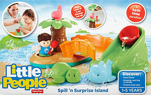 How do you get little ones to enjoy bath time? You pour on the fun with a floating bath toy like the Little People Spill 'n Surprise Island, where tropical adventures await everywhere. Fill up the turtle scoop and pour water through the treetop to make a flamingo magically appear. Or fill the bucket on top of the slide and watch it tip, sending water spilling back into the tub. And don't miss the dolphin sightings offshore - this one floats and squirts water! There's even a Little People beach buddy figure to walk over the bridge, slide down the slide and keep the sea creatures (and your little bather) company.