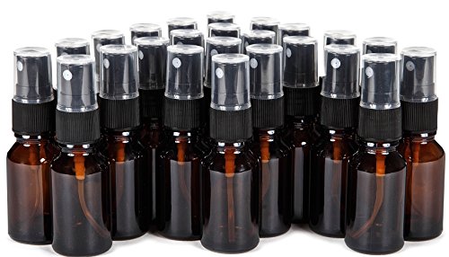 - 24 - 15 ml, Amber Glass Bottles, with Black Fine Mist Sprayers, and Dust caps.