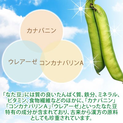 「なた豆」には質の良いたんぱく質、鉄分、ミネラル、ビタミン、食物繊維などのほかに、「カナバニン」「コンカナバリンA」「ウレアーゼ」といったなた豆特有の成分が含まれており、古来から漢方の原料としても珍重されています。
