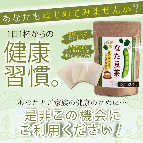 ・原材料名:なた豆(豆、葉、茎、さや)・原産国:日本(熊本・岡山)・内容量:40g(2g×20袋)×2袋・賞味期限:2年間・アレルギー表示:なし・製造メーカー直販の為、中間マージンや広告宣伝費を省くことで、高品質と低価格を実現しました。・栄養豊富な国産なた豆を丸ごと焙煎し、香ばしくクセがなくスッキリとした味わいが特徴です。・「なた豆」には質の良いたんぱく質、鉄分、ミネラル、ビタミン、食物繊維などのほかに「カナバニン」「コンカナバリンA」「ウレアーゼ」といったなた豆特有の成分が含まれています。