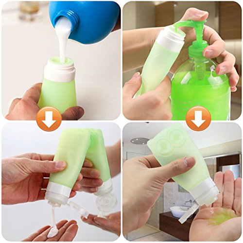 - REFILLABLE & EASY TO CLEAN - Large opening of our silicone travel containers makes refills and cleaning easy. Fill it up with 3/4 of the very liquid you need, leaving room for some air to prevent spill over. You can easily clean these toiletry containers by soaking in warm soapy water or by using the dishwasher (top rack only)