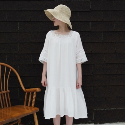 빈티지하면서 여성스러운 무드가 느껴지는 레이어스 디테일에 스퀘어넥 디자인으로 네크라인을 강조하여 목선이 더 이뻐보였어요. 허리부분에는 라인이 잡혀있지않고,스트레이트로 뚝 떨어지는 실루엣이라 55사이즈부터 날씬한 77까지는 무난하게 잘 맞으실 것 같아요. 158cm 모델이 착용하였 때 종아리까지 내려오는 기장감이고,